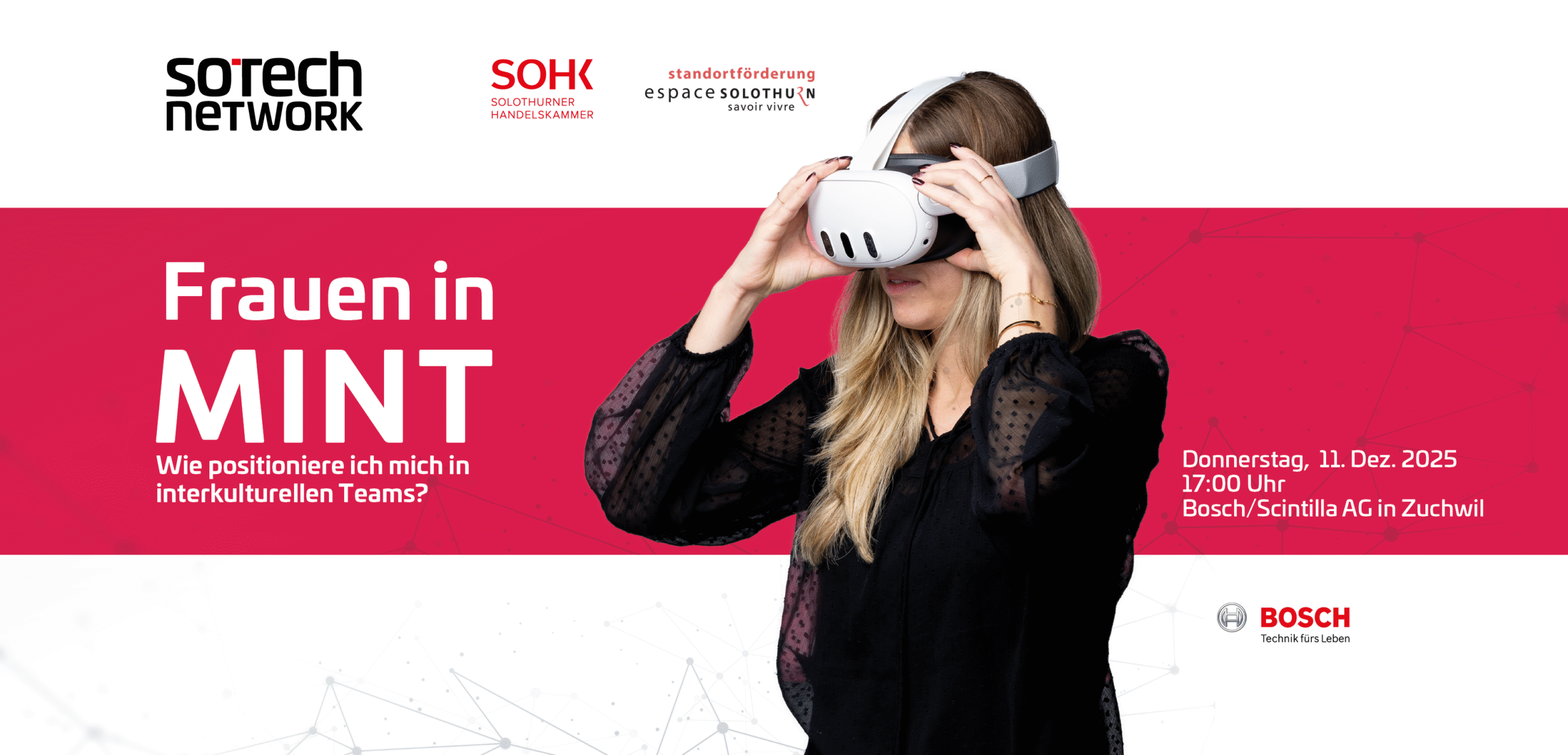 Der Verein SoTech Network lädt Sie in Zusammenarbeit mit der Standortförderung espaceSOLOTHURN, der Solothurner Handelskammer und der Bosch/Scintilla AG ganz herzlich zum Netzwerkanlass «Frauen in MINT | Wie positioniere ich mich in interkulturellen Teams?» ein.